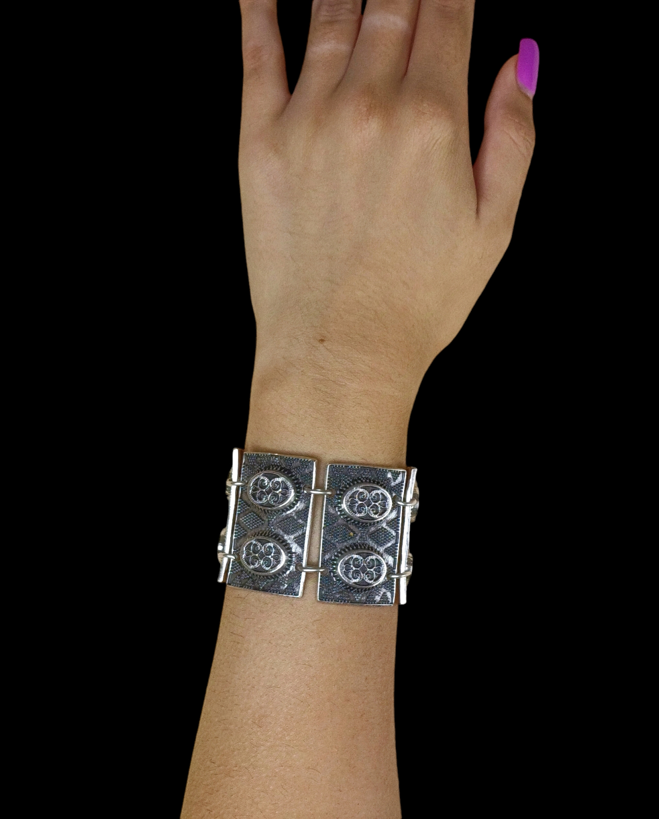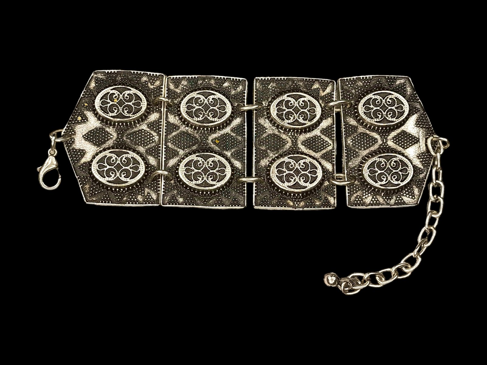 Descoperă eleganța cu această brățară din zamac argintat antichizat, o bijuterie care adaugă un strop de rafinament și farmec fiecărei zile. Designul vintage și detaliile delicate transformă această brățară într-un accesoriu perfect pentru a sublinia stilul tău personal. Această brățară nu doar completează orice ținută, ci adaugă o poveste de stil și eleganță fiecărei apariții. Ideală pentru ocazii speciale sau pentru a adăuga un plus de rafinament ținutelor zilnice, această bijuterie este realizată pentru a rezista în timp, menținându-și strălucirea și farmecul original. Redescoperă magia bijuteriilor clasice și bucură-te de frumusețea oferită de această brățară din zamac antichizat.