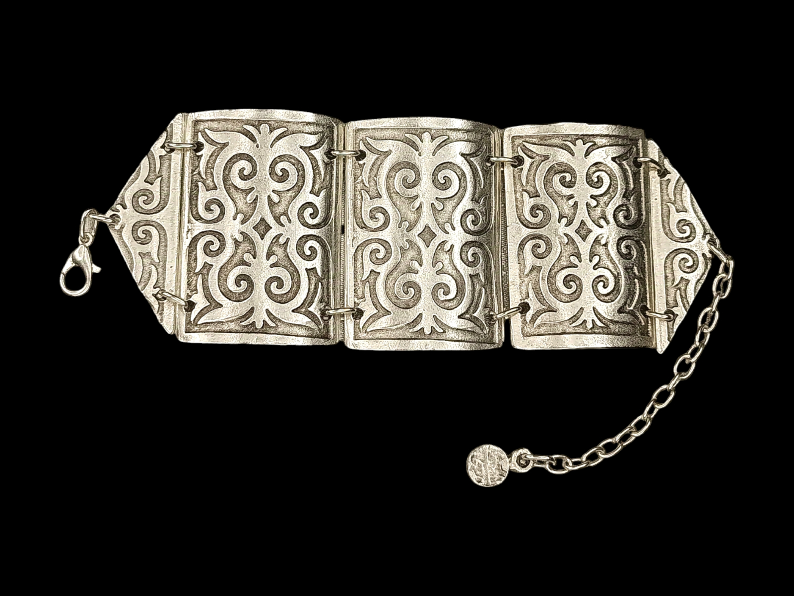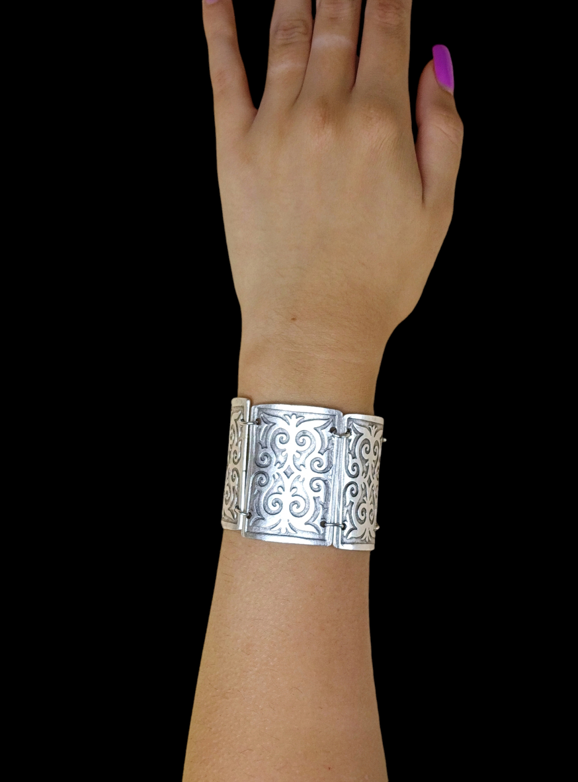 Adaugă un farmec clasic colecției tale de bijuterii cu această brățară din zamac argintat antichizat. Designul vintage și detaliile delicate transformă această brățară într-un accesoriu perfect pentru a sublinia eleganța și rafinamentul personal. Fiecare element al acestei bijuterii evocă un aer de noblețe și distincție, oferindu-ți un plus de stil și frumusețe. Ideală pentru ocazii speciale sau pentru a aduce un strop de eleganță zilnică, această brățară este realizată pentru a rezista în timp, menținându-și strălucirea și farmecul original. Redescoperă magia bijuteriilor clasice și bucură-te de frumusețea oferită de această brățară din zamac antichizat. Simte-te specială și admirată cu acest accesoriu care adaugă un strop de istorie la fiecare apariție.
