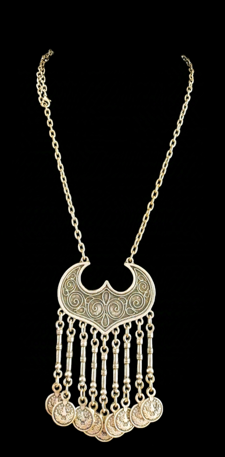 Acest superb colier din Zamac este o adevărată bijuterie de artă, perfect pentru a adăuga un plus de eleganță și rafinament oricărei ținute. Colierul prezintă un design unic, cu un pandantiv central în formă de semilună, decorat cu motive spiralate care emană un aer de mister și sofisticare. De la pandantiv atârnă opt medalioane delicate, fiecare gravat cu detalii fine, care adaugă un element de mișcare și strălucire. Beneficii ale purtării acestui colier Purtarea acestui colier aduce multiple beneficii: