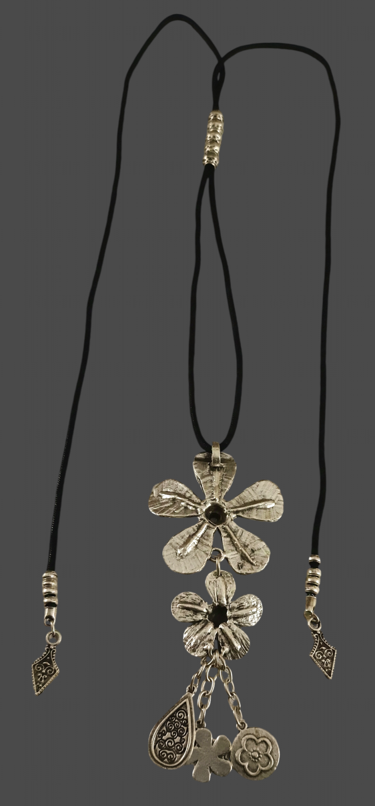 Acest superb colier din zamac și șnur negru este o piesă de bijuterie care emană rafinament și eleganță. Colierul este compus dintr-un șnur negru, decorat cu elemente metalice și un pandantiv central în formă de floare, cu detalii fine și delicate. Pandantivul este completat de trei mici charm-uri: o lacrimă cu motive florale, un trifoi și o floare stilizată. Beneficiile purtării acestui colier Beneficiile purtării acestui colier sunt multiple. În primul rând, designul său elegant și sofisticat adaugă o notă de mister și carismă oricărei ținute. Este perfect pentru a fi purtat la evenimente speciale, dar și pentru a adăuga un plus de eleganță în viața de zi cu zi. Colierul poate fi asortat cu o rochie de seară pentru un look rafinat sau cu o ținută casual pentru a adăuga un element de surpriză și stil. Avantaje oferite
