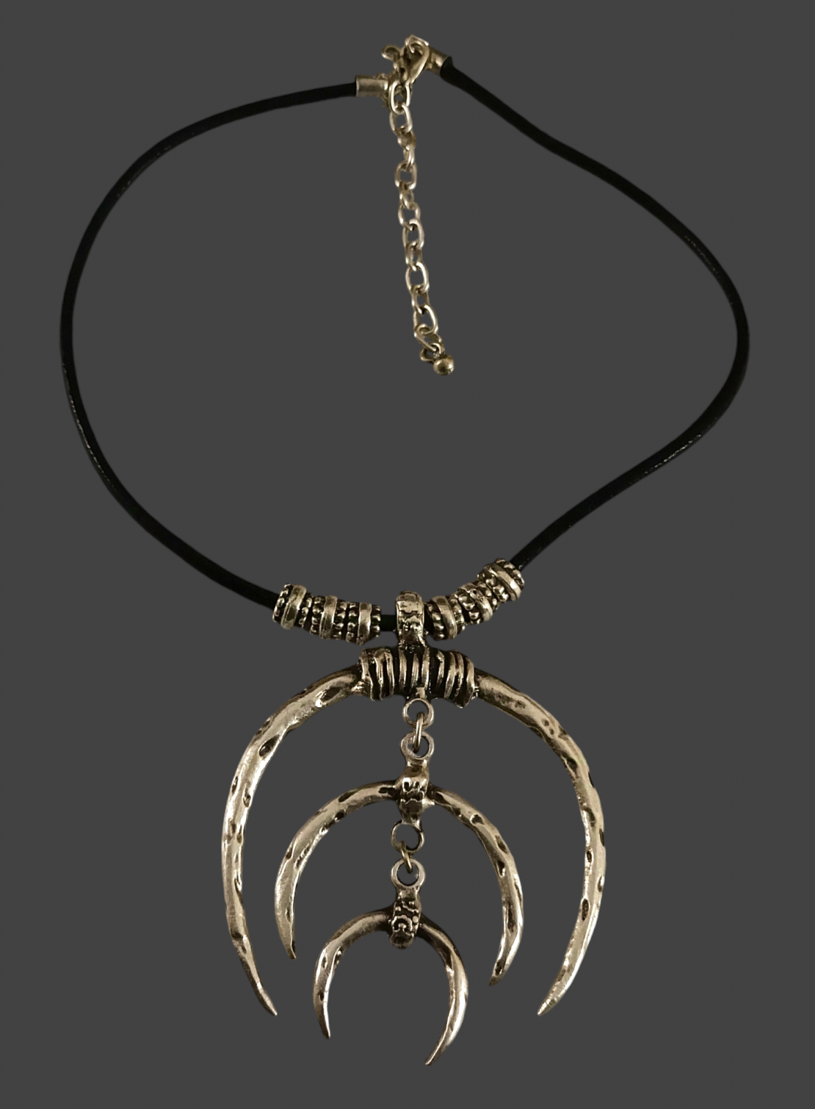 Acest colier superb este realizat din zamac de înaltă calitate și este completat de un șnur negru din piele, oferind un contrast elegant și rafinat. Designul său unic, cu trei pandantive în formă de semiluna, emană o atitudine puternică și misterioasă, perfectă pentru a sublinia personalitatea și încrederea în sine a purtătoarei. Beneficiile purtării acestui colier Beneficiile purtării acestui colier sunt multiple: adaugă un plus de carismă și eleganță oricărei ținute, fie că este vorba de o ocazie specială sau de o zi obișnuită. Colierul poate fi asortat cu o rochie neagră pentru un look sofisticat sau cu o ținută casual pentru a adăuga un element de surpriză și unicitate. Caracteristici