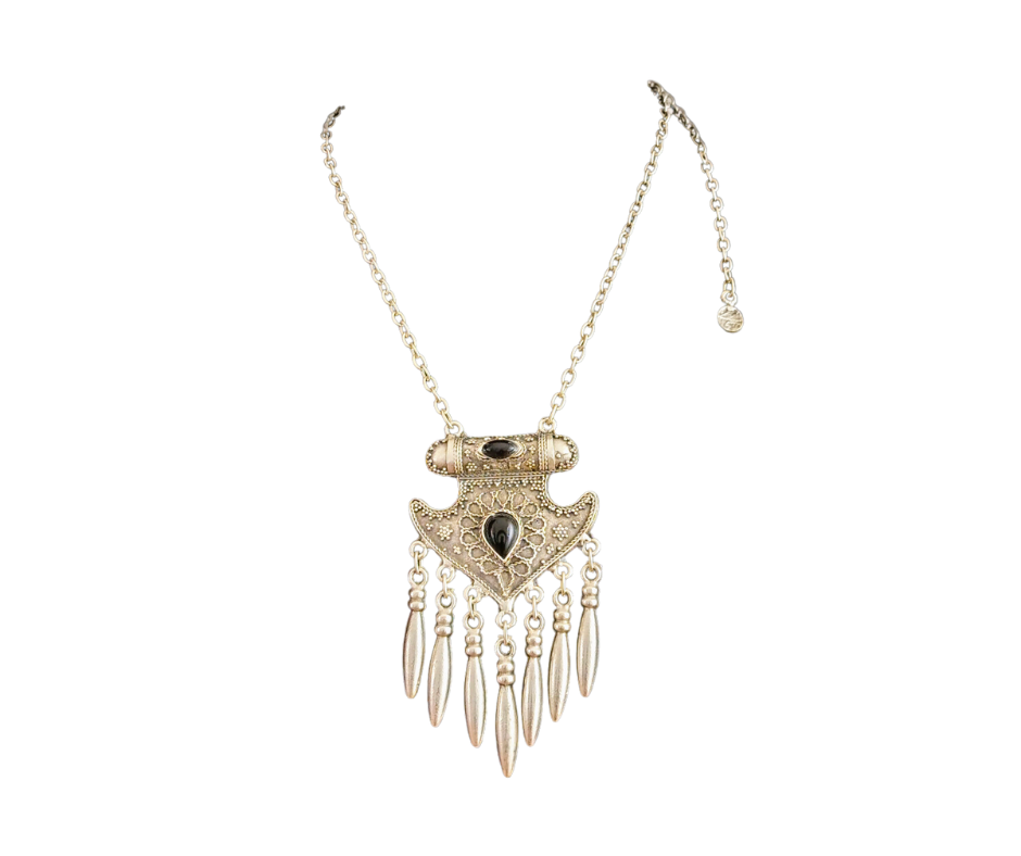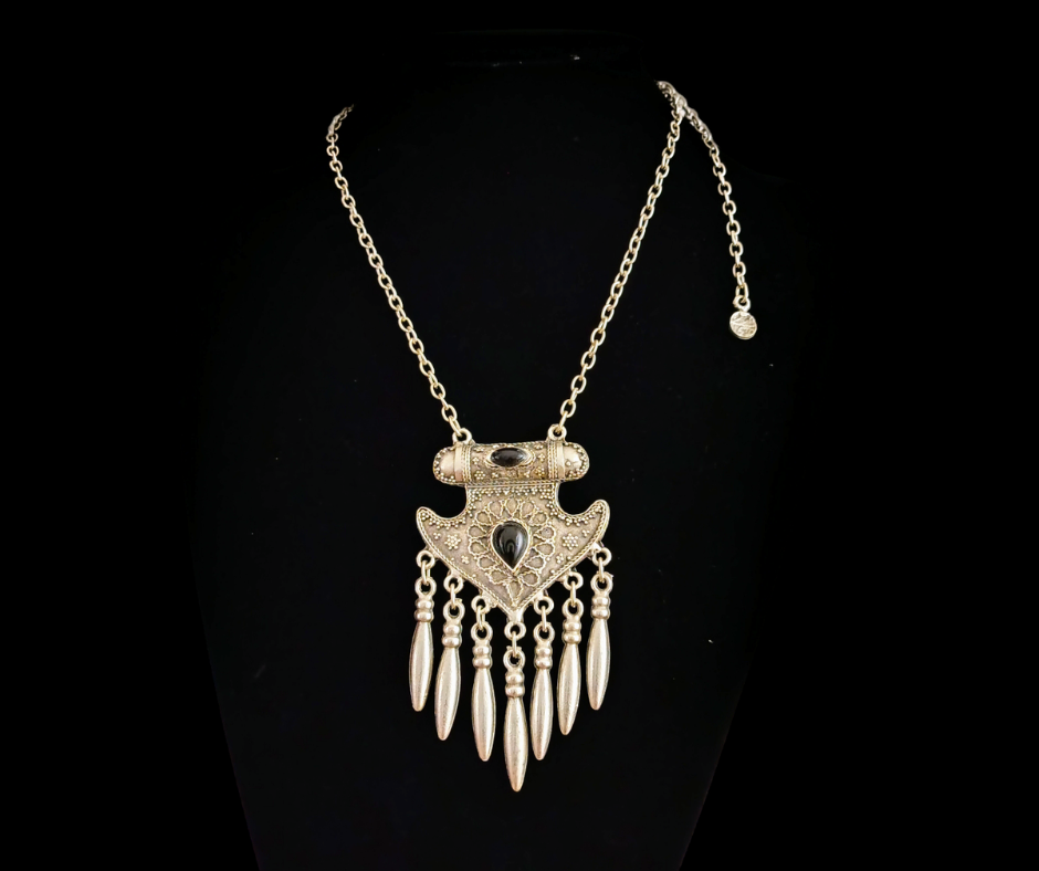 Acest colier din zamac impresionează prin frumusețea sa misterioasă și designul sofisticat. Este o piesă de bijuterie care inspiră încredere și putere, fiind ideală pentru o femeie carismatică și elegantă. Acest accesoriu modern și rafinat este un simbol al calității, aducând un plus de personalitate și oportunitate fiecărei apariții.