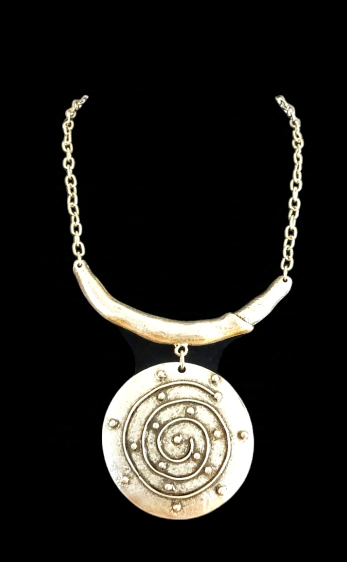 Acest superb colier din zamac este o piesă de bijuterie care emană eleganță și rafinament. Colierul este compus dintr-un lanț robust și un pandantiv circular cu un design spiral, decorat cu mici puncte metalice, care adaugă un plus de textură și detaliu. Beneficiile purtării acestui colier Purtarea acestui colier oferă multiple avantaje: