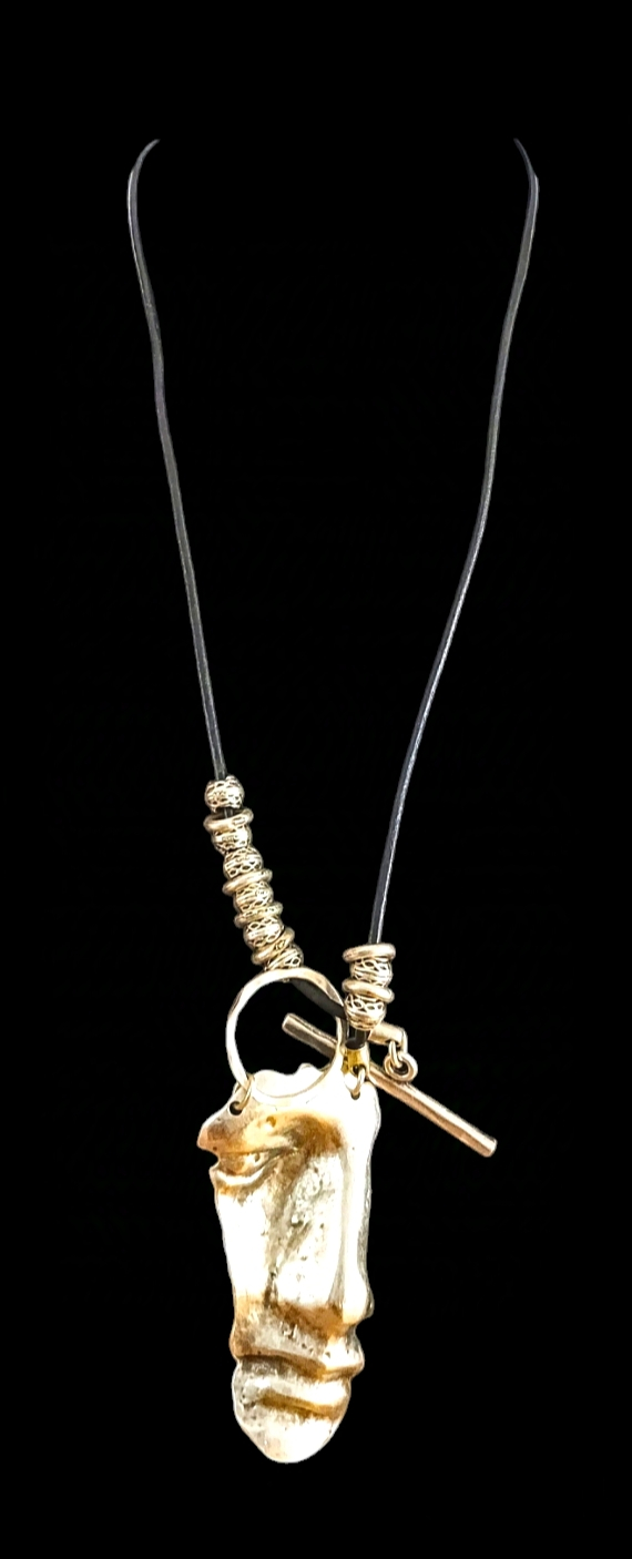 Imaginează-ți că porți acest colier superb, o combinație elegantă de zamac și piele neagră, care adaugă un strop de rafinament și stil oricărei ținute. Piesa centrală a colierului este un pandantiv din zamac, cu un design abstract și artistic, ce atrage privirile și stârnește admirația celor din jur. Pandantivul este suspendat pe un șnur din piele neagră, care adaugă un contrast subtil și sofisticat întregului ansamblu. Beneficiile purtării acestui colier