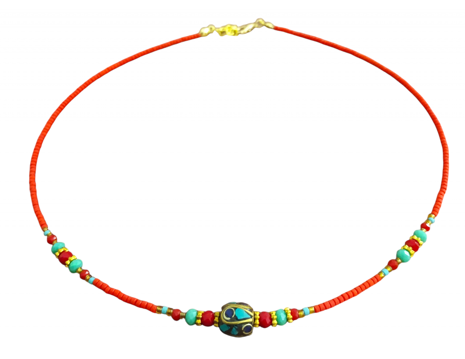 Adaugă o notă de eleganță exotică colecției tale de bijuterii cu acest colier lucrat manual. Piesa centrală, o mărgea "Nepal", este înconjurată de rondele de sticlă fațetată și mărgele colorate, toate montate pe fir de sârmă siliconată. Designul său unic și durabilitatea fac din acest colier o alegere perfectă pentru orice ocazie.